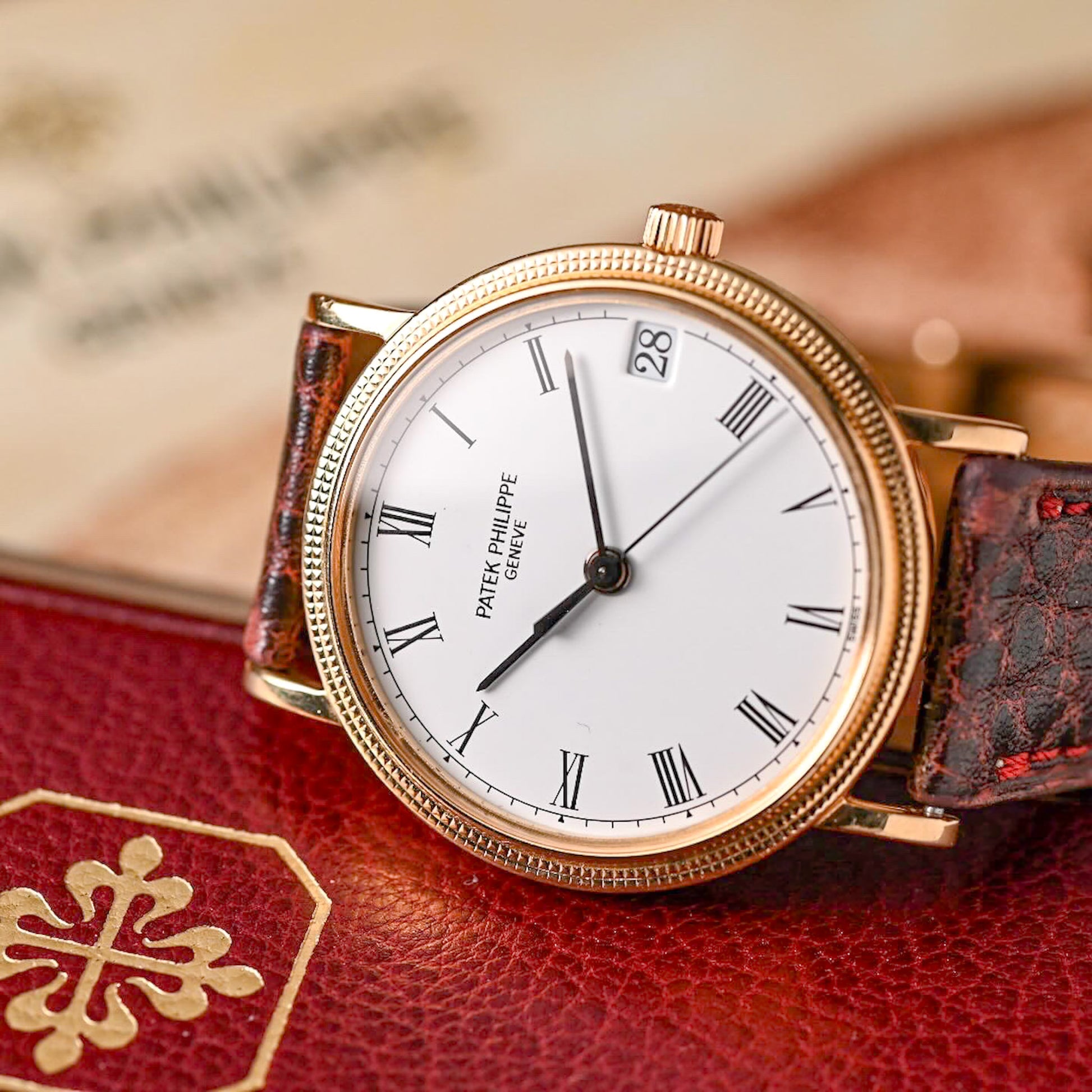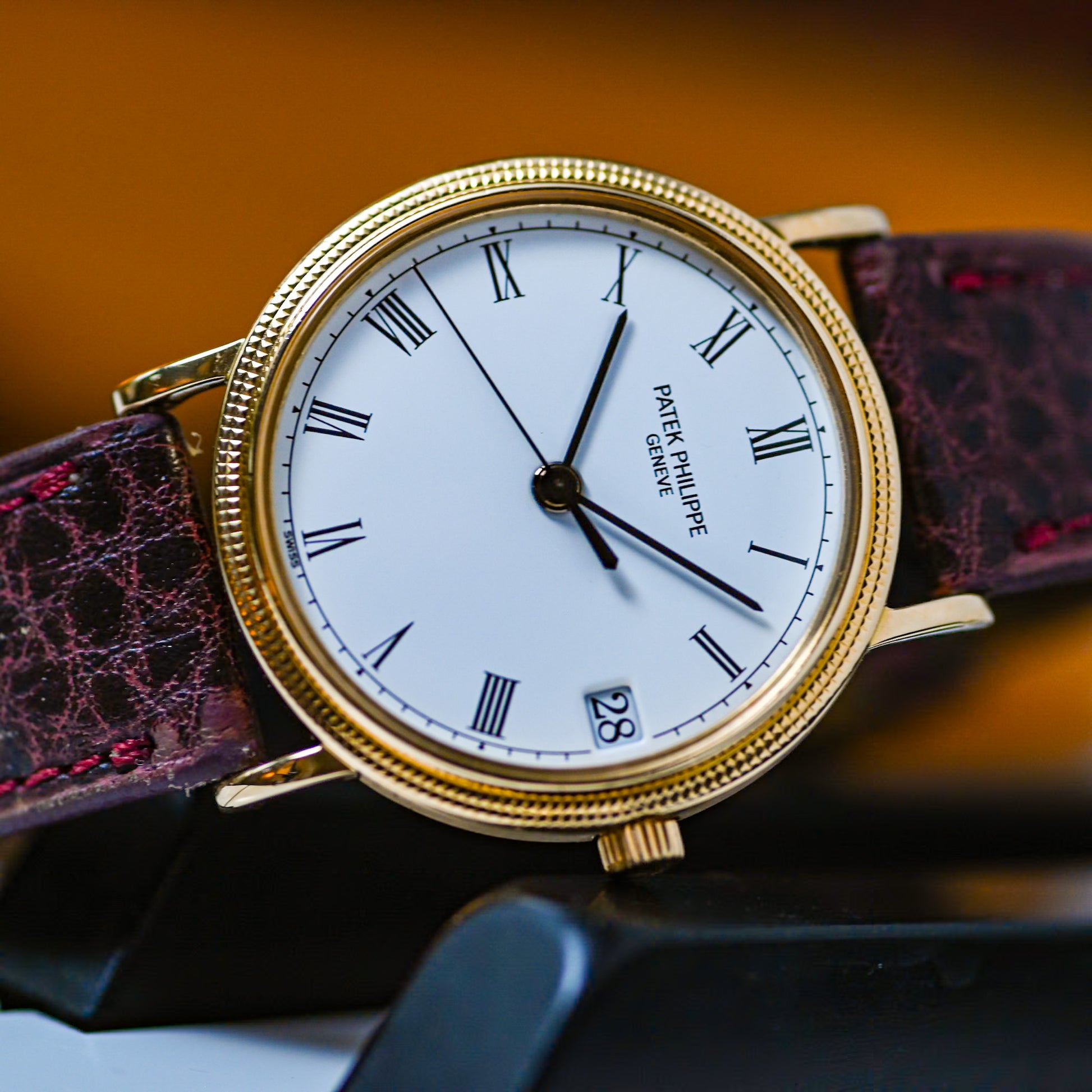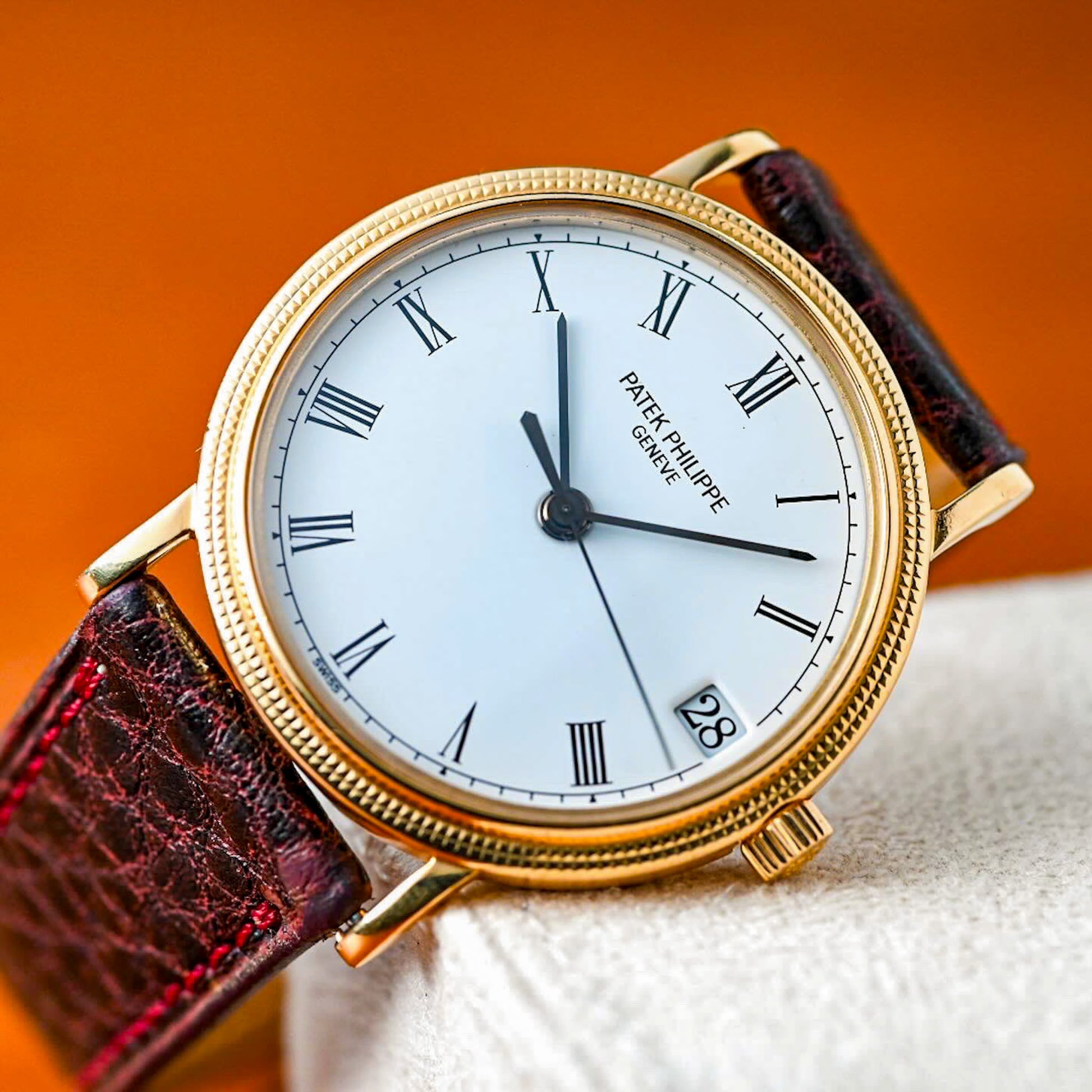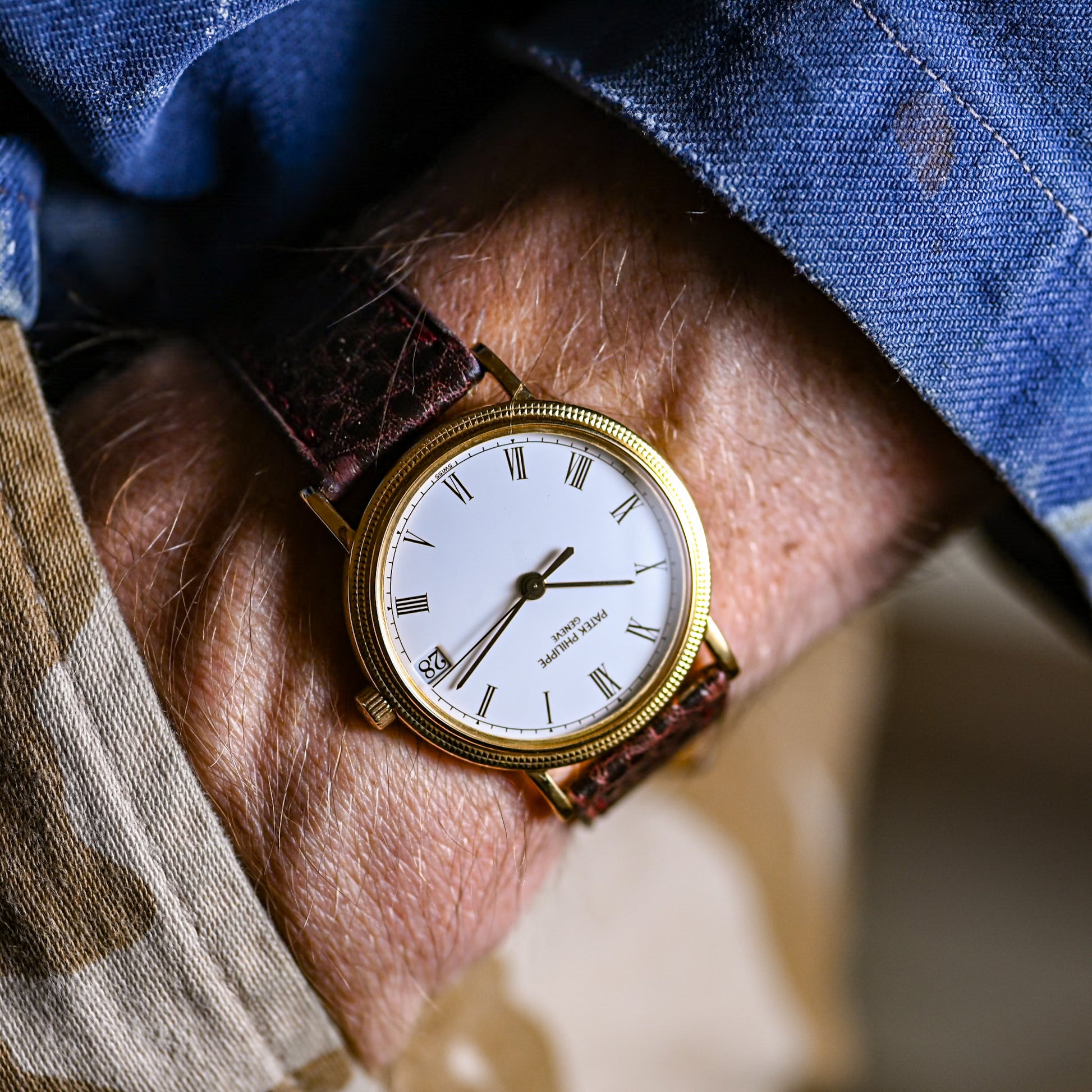 Patek Philippe Calatrava, perhaps the most classic dress watch that you can find. The white porcelain dial together with the Clous de Paris bezel adds an extra dimension.
