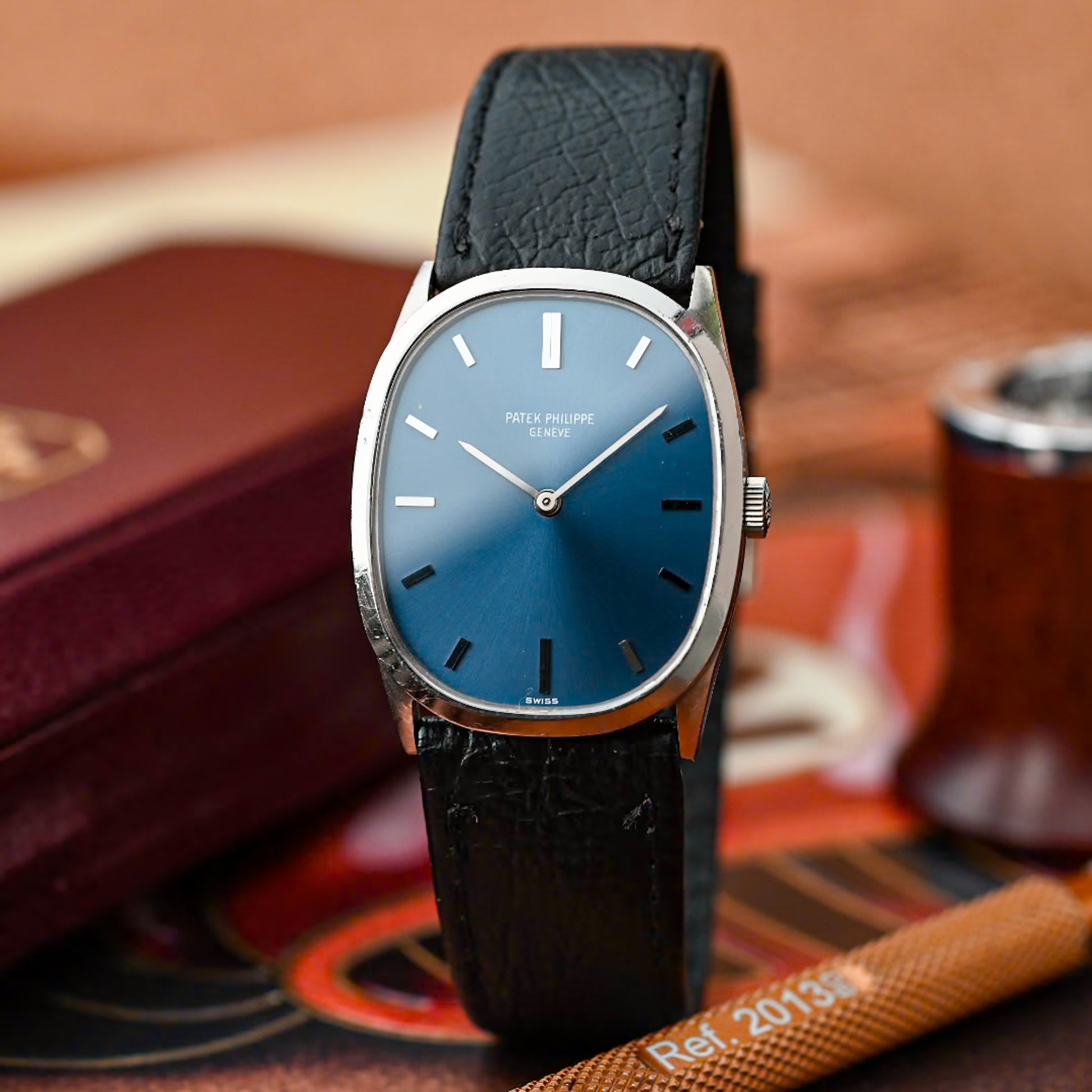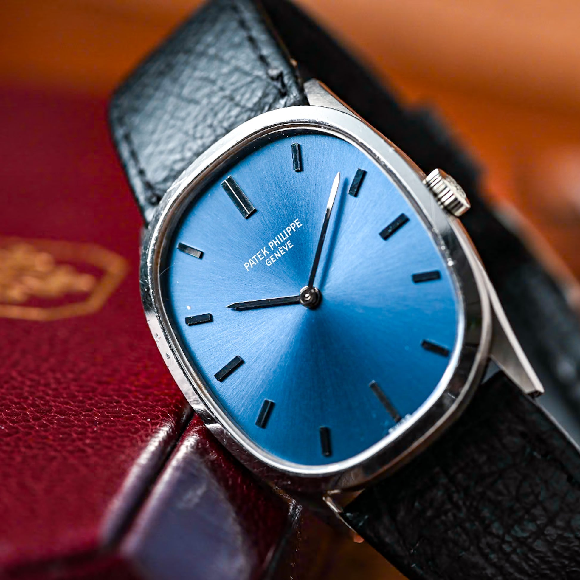 We have loved the Patek Philippe Ellipse for many years now. This one it is rare to see when it comes in white gold and blue dial.