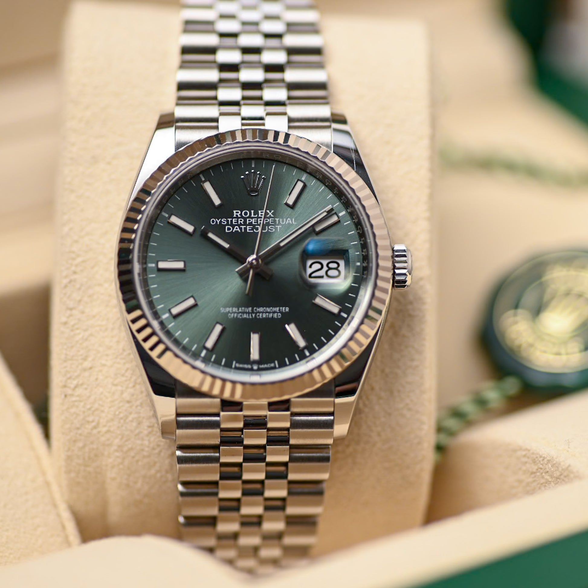 The Datejust 36mm delivers a lot of bang for your buck. It is waterproof to a depth of 100 metres (330 feet). That’s thanks to the brand’s patented Twinlock double waterproofness system. The winding crown screws down against the case to ensure a secure seal. The crystal, with iconic Cyclops lens at 3 o’clock for easy reading of the date, is sapphire.
